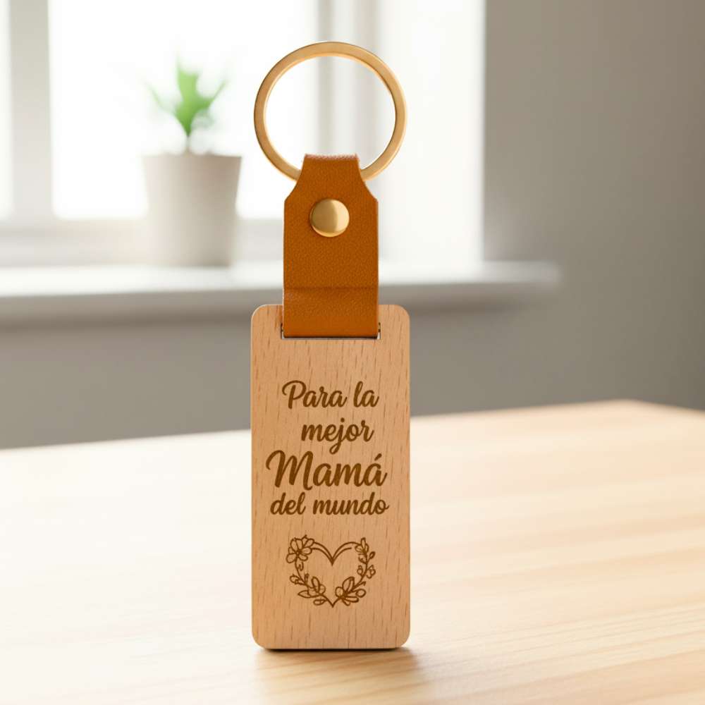 Llavero colgante fabricado en madera natural y cuero sintético, con anillas de hierro resistentes. Su diseño rectangular combina estilo rústico y moderno, ideal como accesorio personal o detalle personalizado.