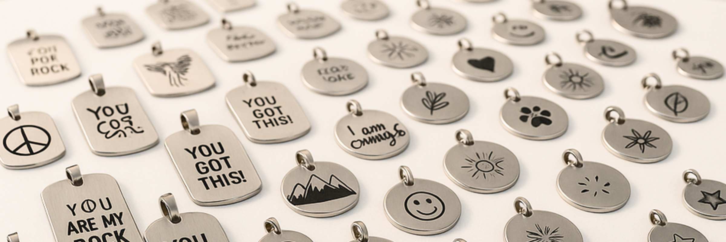 Com a tecnologia de laser de fibra, podemos gravar as suas ideias em diferentes tipos de metais a um preço muito competitivo, bem como um desconto por quantidade. Usando a sua criatividade pode criar peças únicas para montar nos seus colares, pulseiras personalizadasentão brincos. Dê um toque surpreendente às suas criações. Sabia que as pessoas preferem colares gravados a colares comuns e não gravados? Isto deve-se principalmente ao facto de lhe dar a opção de criar uma versão personalizada para as suas necessidades.